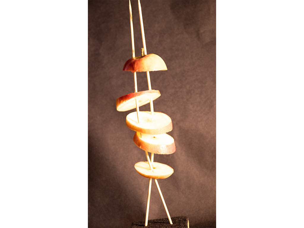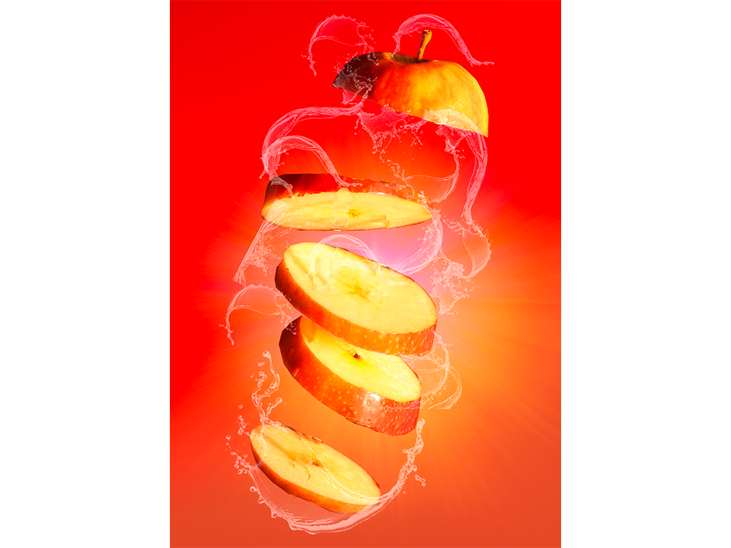 Als Ausgangsmotiv diente ein Apfel, den ich selbst geschnitten und die einzelnen Stücke bewusst so arrangiert habe, dass sie den Eindruck erwecken, frei in der Luft zu schweben. Die Fotografie habe ich eigenständig umgesetzt von der Bildidee über den Aufbau bis hin zur Aufnahme.